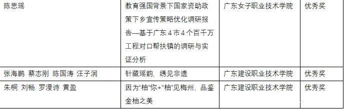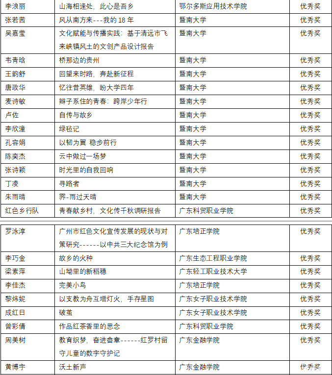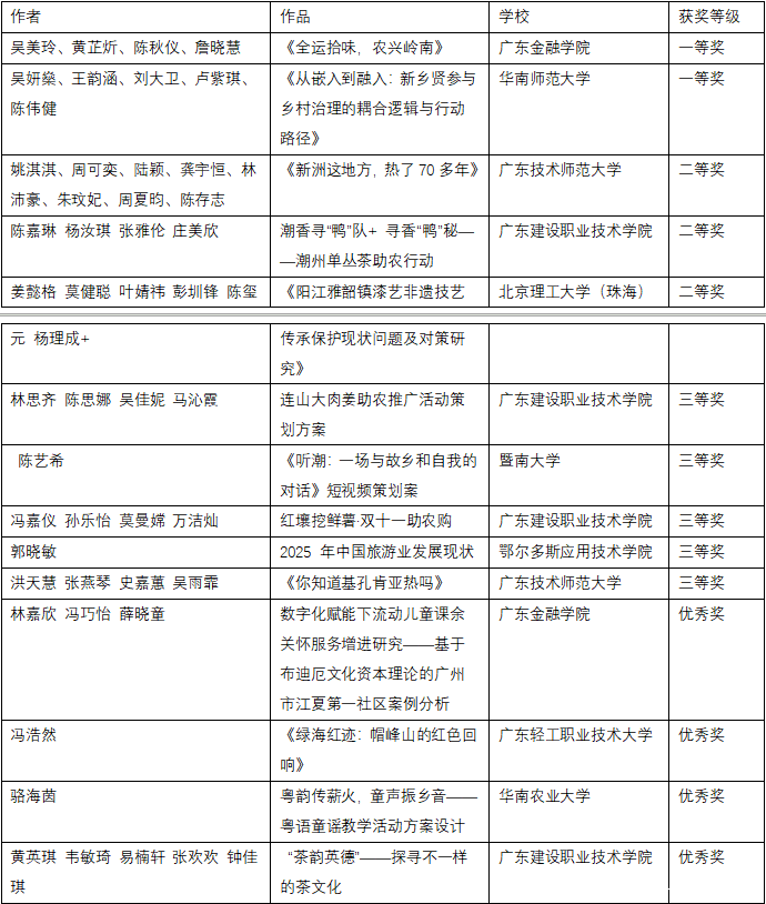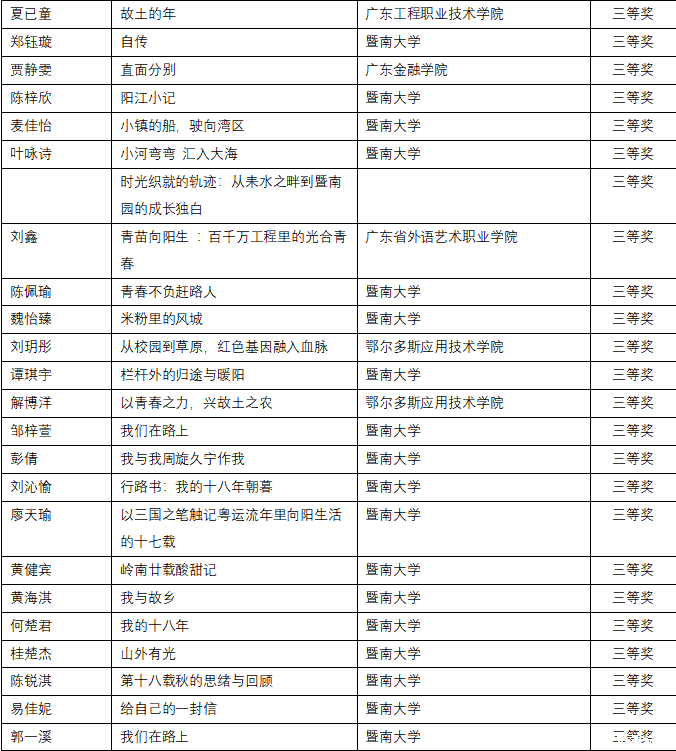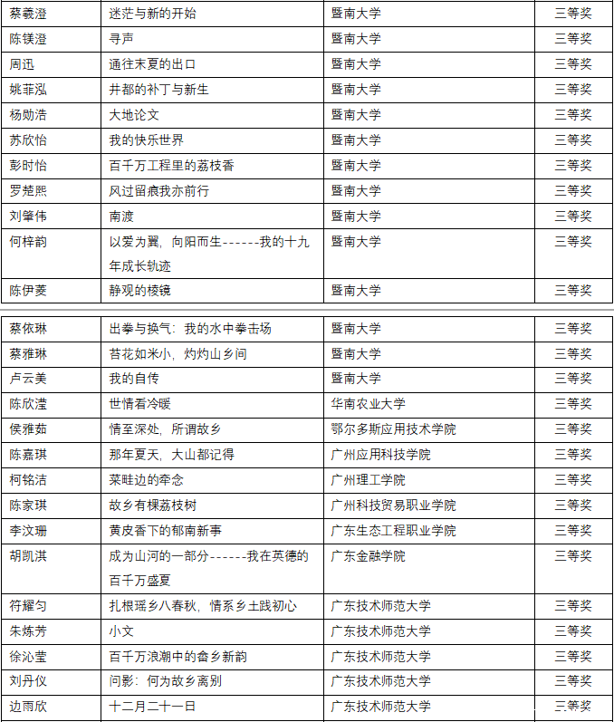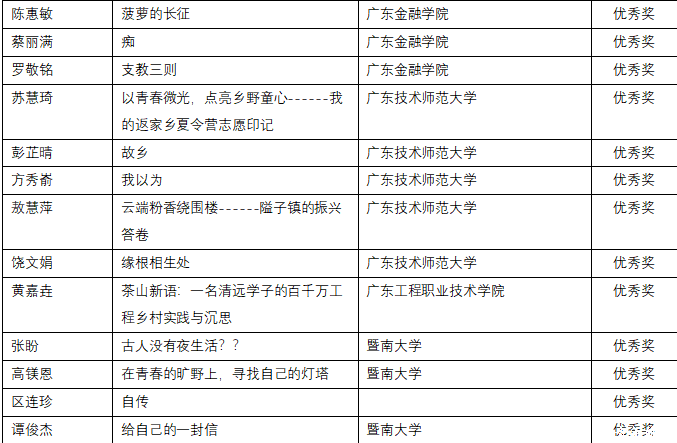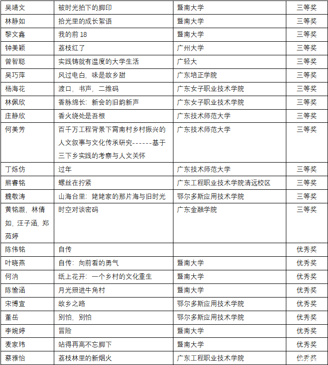 经评审委员会严格评审,创意写作类与短视频策划类分别评选出一、二、三等奖及优秀奖若干。其中广东金融学院路晨阳《结婚》、黄悦禧《潮声里的根》在创意写作赛道荣获一等奖、陈钰琳《给圣·埃克苏佩里的信》、林烯潼《寻访革命母亲李梨英》、龙洋《月长明》在创意写作赛道荣获二等奖,胡凯淇《成为山河的一部分------我在英德的百千万盛夏》,贾静雯《直面分别》,黄铭灏,林倩如,汪子涵,郑苑婷《时空对谈密码》在创意写作赛道荣获三等奖,黄博宇《沃土新声》,陈惠敏《菠萝的长征》,蔡丽满《痴》,周美树《教育织梦,奋进畲章------红罗村留守儿童的数字守护记》,罗敬铭《支教三则》在创意写作赛道荣获优秀奖。在短视频策划类比赛中,吴美玲、黄芷炘、陈秋仪、詹晓慧团队的作品《全运拾味,农兴岭南》亦荣获一等奖。
